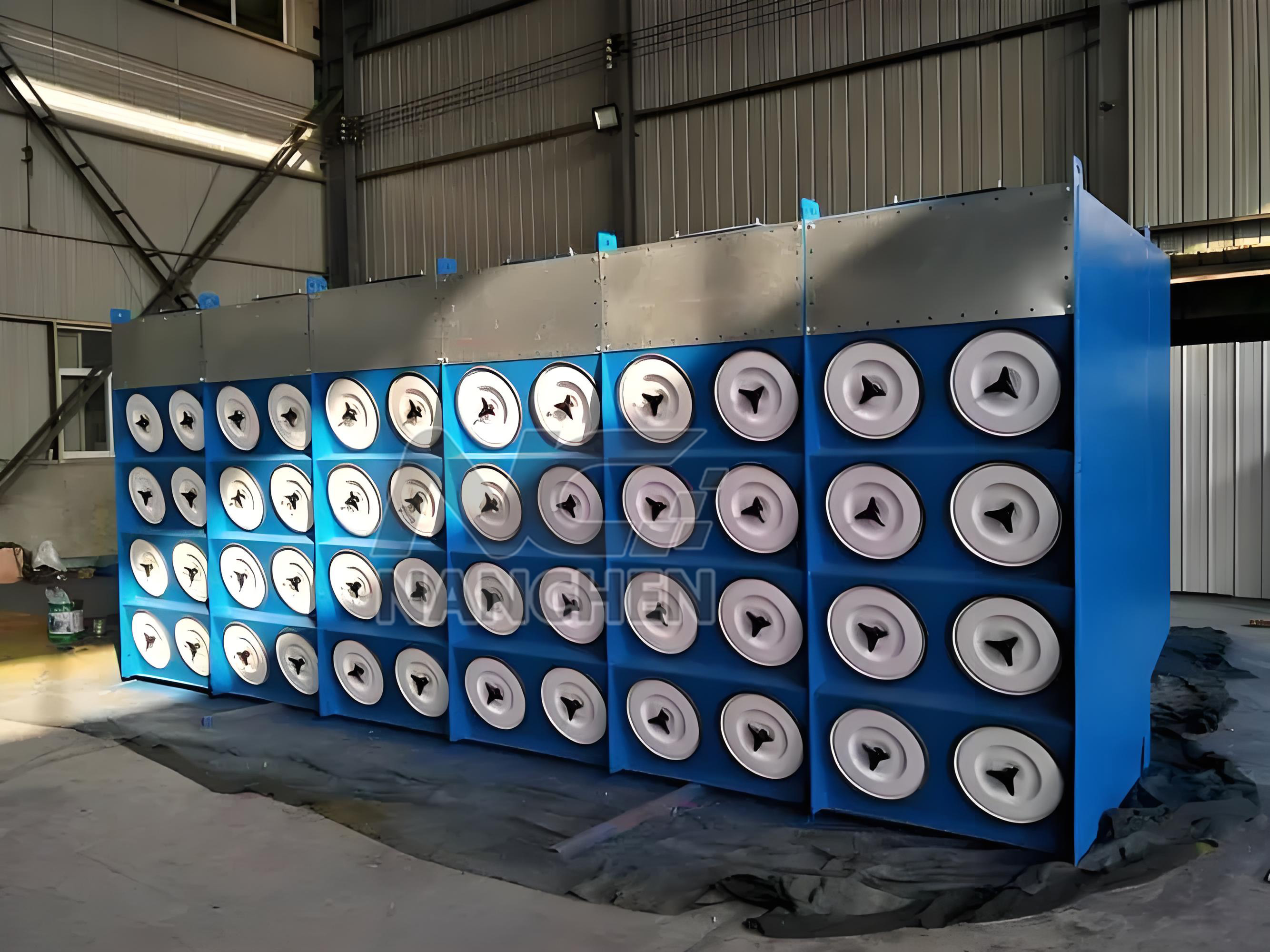 The resistance of the filter cartridge dust collector increases with the increase of the thickness of the dust layer on the surface of the filter material. Clean the dust when the resistance reaches a certain specified value. At this time, the PLC program controls the opening and closing of the pulse valve, the lifting valve of the first chamber is closed, the filtered airflow is cut off, and then the electromagnetic pulse valve is opened. Compressed air and a short period of time rapidly expand in the upper box and rush into the filter cartridge, causing the filter cartridge to expand and deform, generating vibration. Under the action of reverse airflow brushing, the dust attached to the outer surface of the filter bag is peeled off and falls into the ash hopper. After the dust cleaning is completed, the electromagnetic pulse valve closes, the lift valve opens, and the chamber returns to the filtering state. The cleaning process is carried out sequentially in each room, starting from the cleaning of each room and ending with the next cleaning cycle. The fallen dust falls into the ash hopper and is discharged through the ash removal valve.