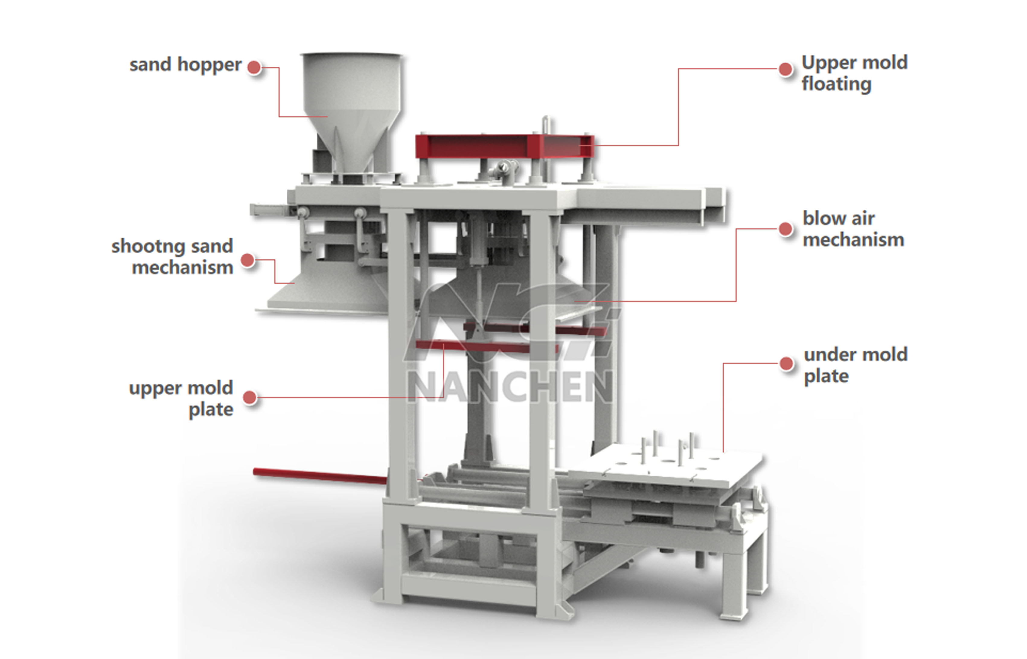 The lower template of the machine can be removed to the outside of the sand shooting station for easy core removal and mold replacement.