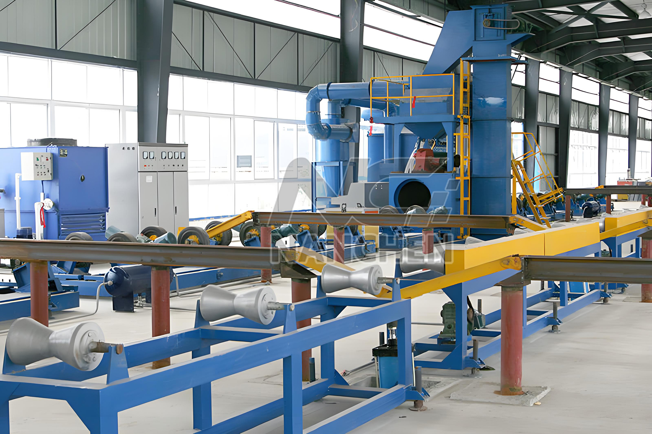 The working principle of the steel pipe outer wall shot blasting machine is to use a shot blasting device to throw high-speed pellets to strike the steel pipe. The surface of the cast pipe is transformed into a fine and bright metallic primary color, which can improve the tensile and tensile strength of the workpiece surface, and also has roughness, which can achieve anti corrosion, protect the pipe, and extend the service life of the steel pipe.